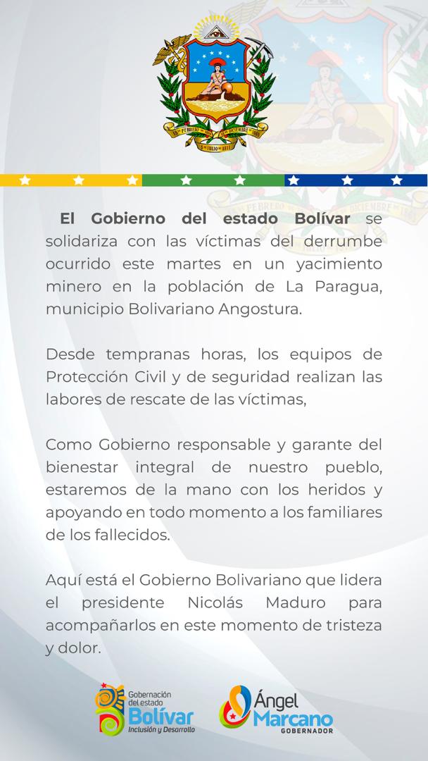 En un comunicado, el Gobierno del estado Bolívar se solidarizó con las víctimas del derrumbe, y precisó que “desde tempranas horas, los equipos de Protección Civil y de seguridad realizan las labores de rescate de las víctimas”.