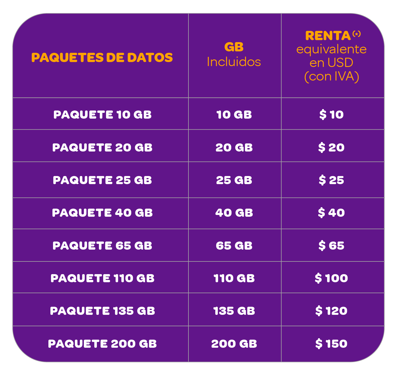 En el caso del paquete de 40GB, el valor es de 40 dólares; el de 65GB en 65 dólares; el de 110GB en 100 dólares; el de 135GB en 120 dólares y el de 200GB en 150 dólares.