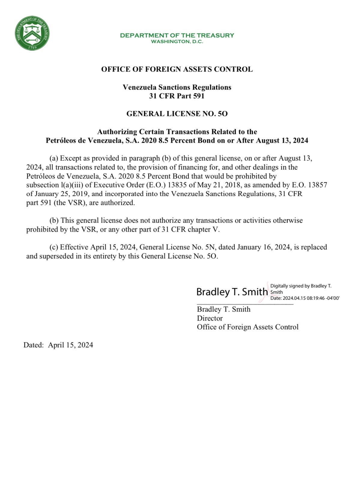Así lo comunicó la Oficina de Control de Activos Extranjeros (OFAC), adscrita al Departamento del Tesoro, mediante la licencia número 50.