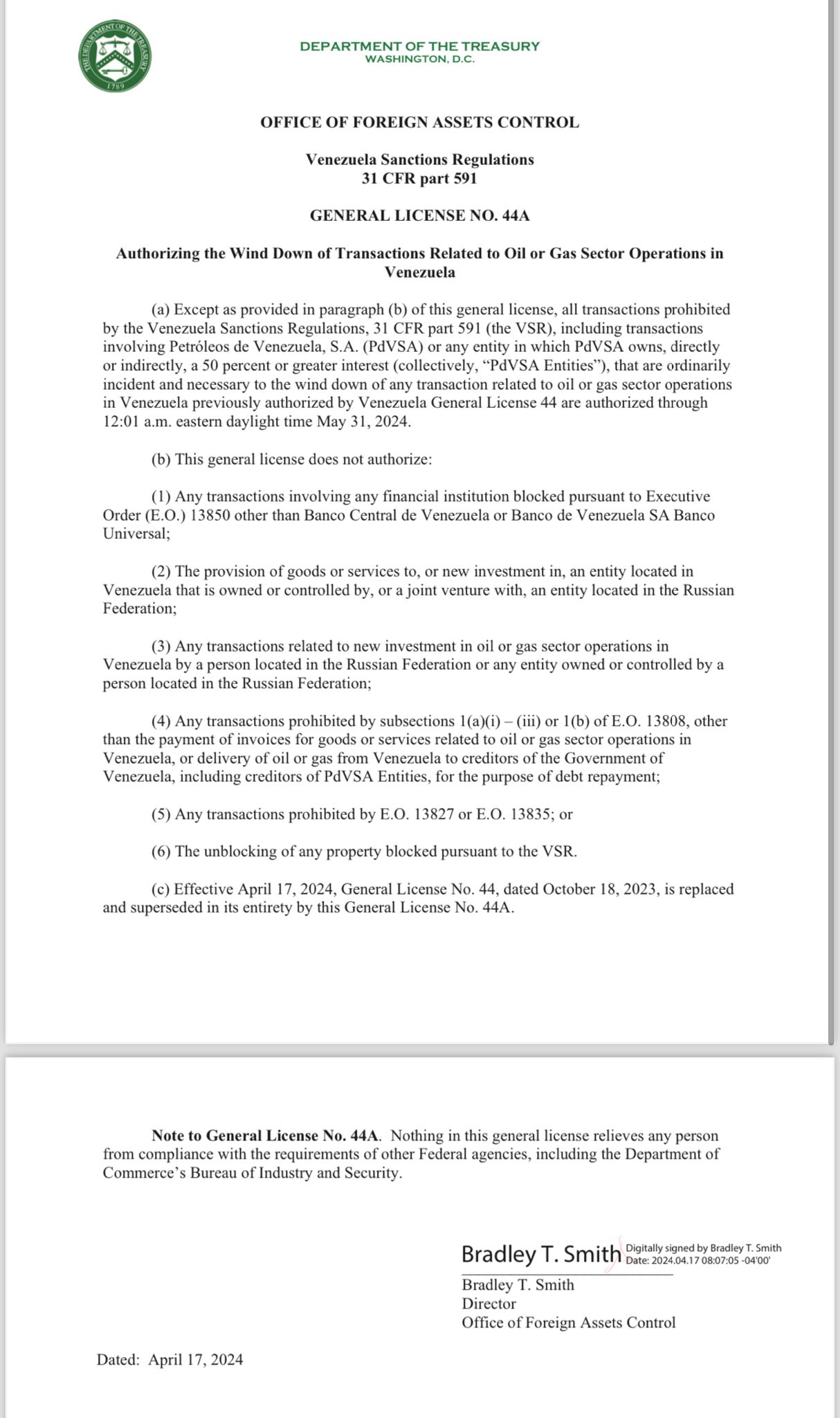 Precisamente, el Departamento del Tesoro de Estados Unidos emitió una licencia de reemplazo a la 44, para otorgar a las empresas 45 días –hasta el 31 de mayo- para «cerrar» sus negocios y transacciones con el sector de petróleo y gas venezolano.