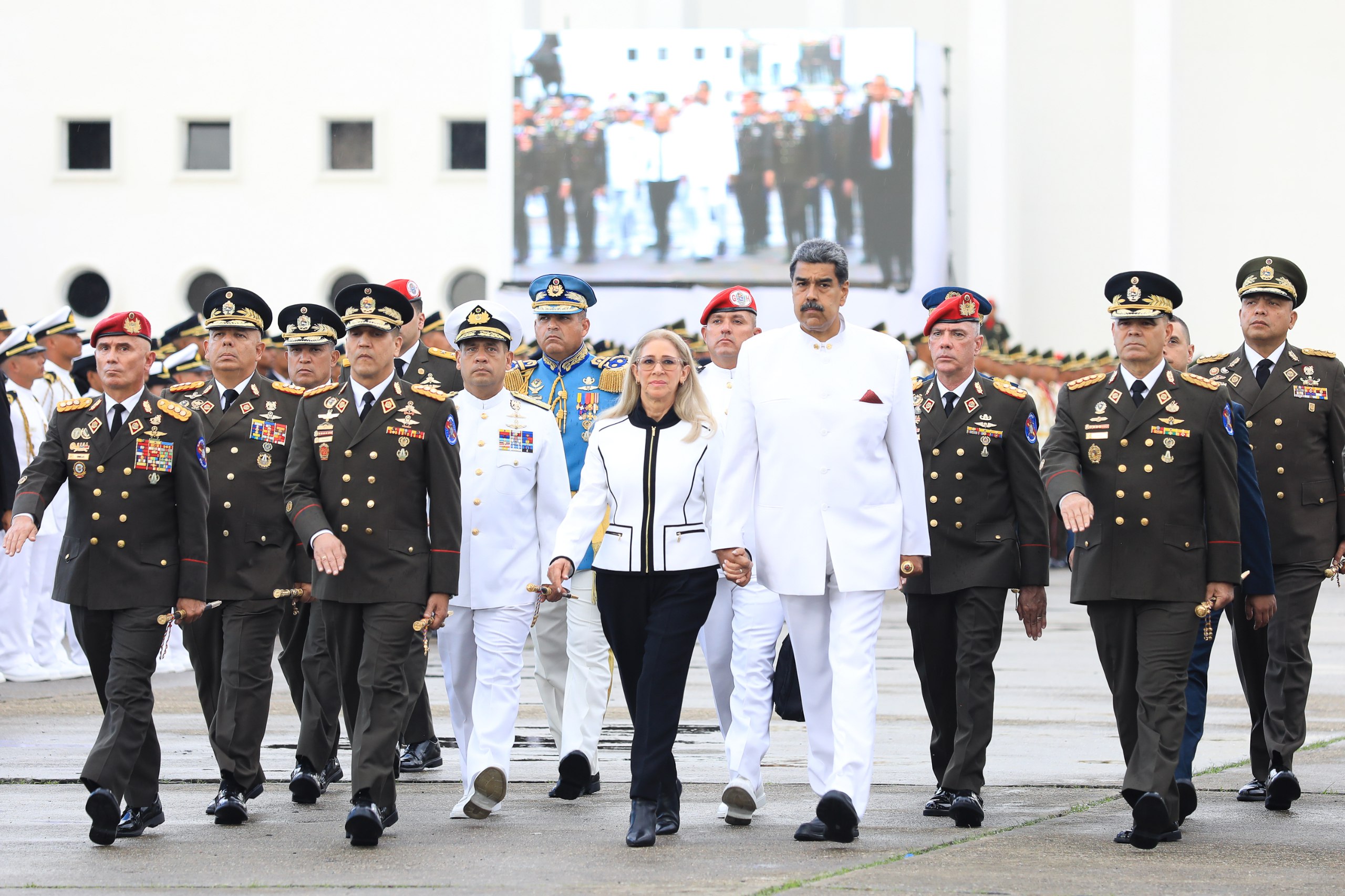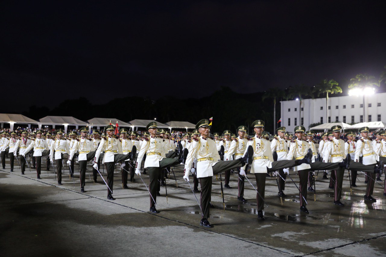 Acompañan al mandatario venezolano, la primera combatiente de la República y diputada a la Asamblea Nacional, Cilia Flores; el vicepresidente de Soberanía Política, Seguridad y Paz y ministro del Poder Popular para la Defensa, General en Jefe, G/J Vladímir Padrino López; Comandante Estratégico Operacional de la FANB, G/J Domingo Hernández Lárez; así como el M/G Félix Osorio, rector de la Universidad Militar Bolivariana de Venezuela; y Oficiales Generales y Almirantes, integrantes del Estado Mayor Superior de la FANB.