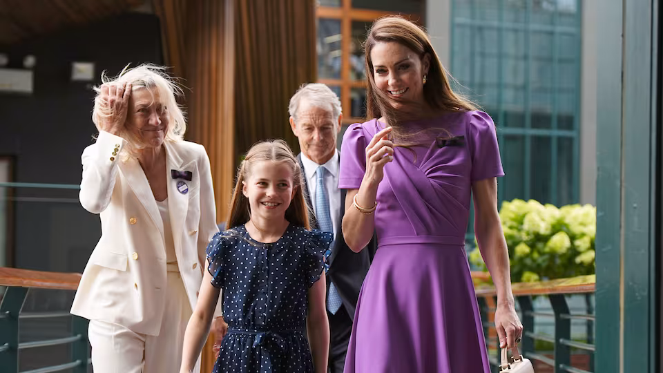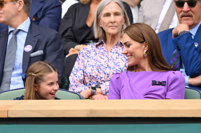 Ataviada con gafas de sol y un vestido de color púrpura, la princesa de Gales aplaudió con ganas muchos de los puntos entre Alcaraz y su rival, el serbio Novak Djokovic, mientras comentaba con su hija los avatares del partido.