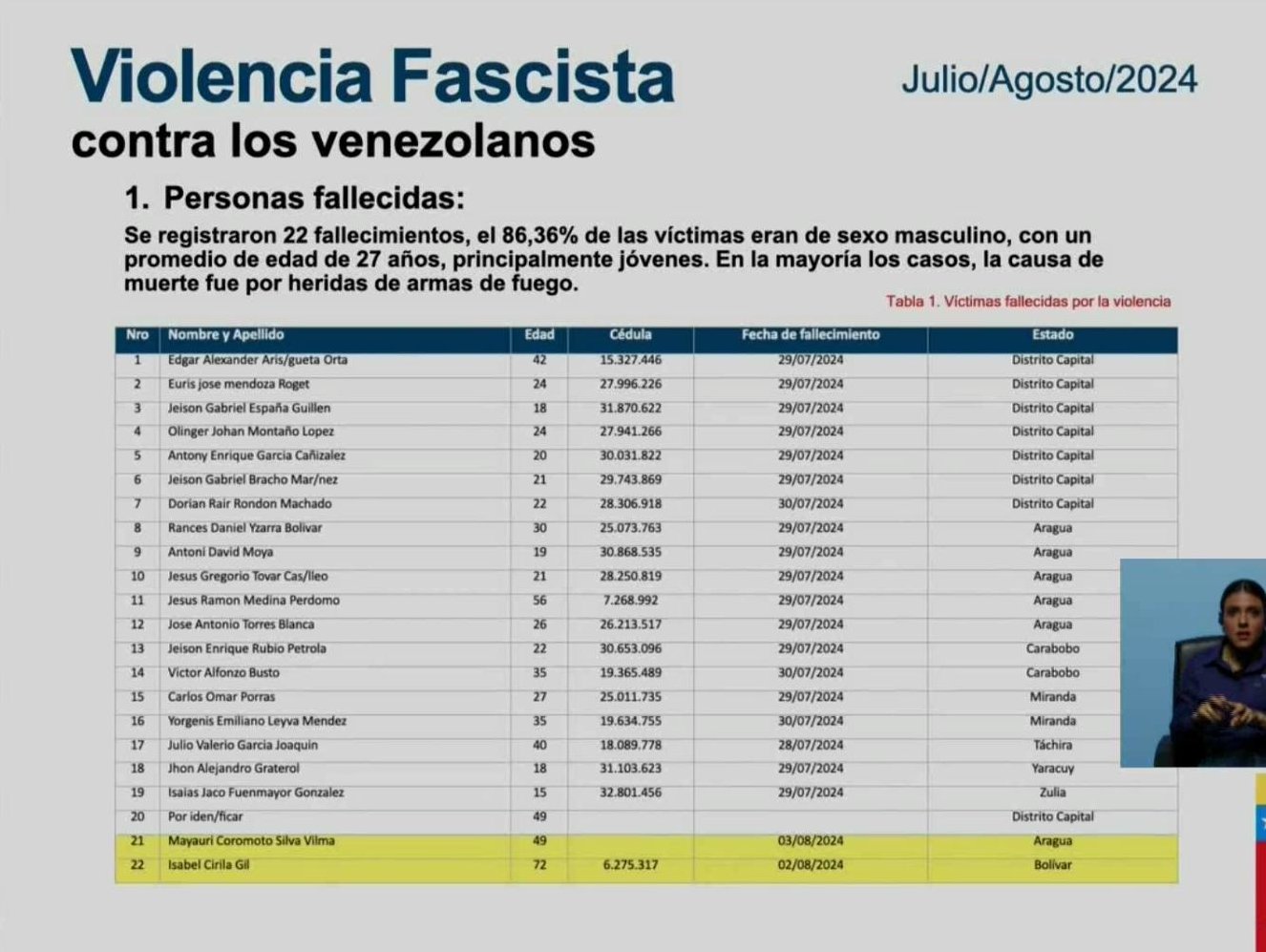 La vicepresidenta de la República, Delcy Rodríguez, presentó este lunes un informe sobre las personas fallecidas por los recientes hechos violentos perpetrados por la ultraderecha en el país.