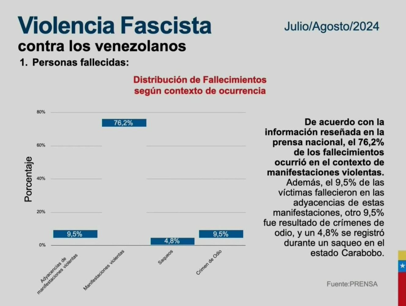 De acuerdo con Rodríguez, el 76% de los fallecimientos se produjeron en el contexto de manifestaciones violentas, 9,5% en sus adyacencias, 9,5% por crímenes de odio y 4,8% durante un saqueo en Carabobo.