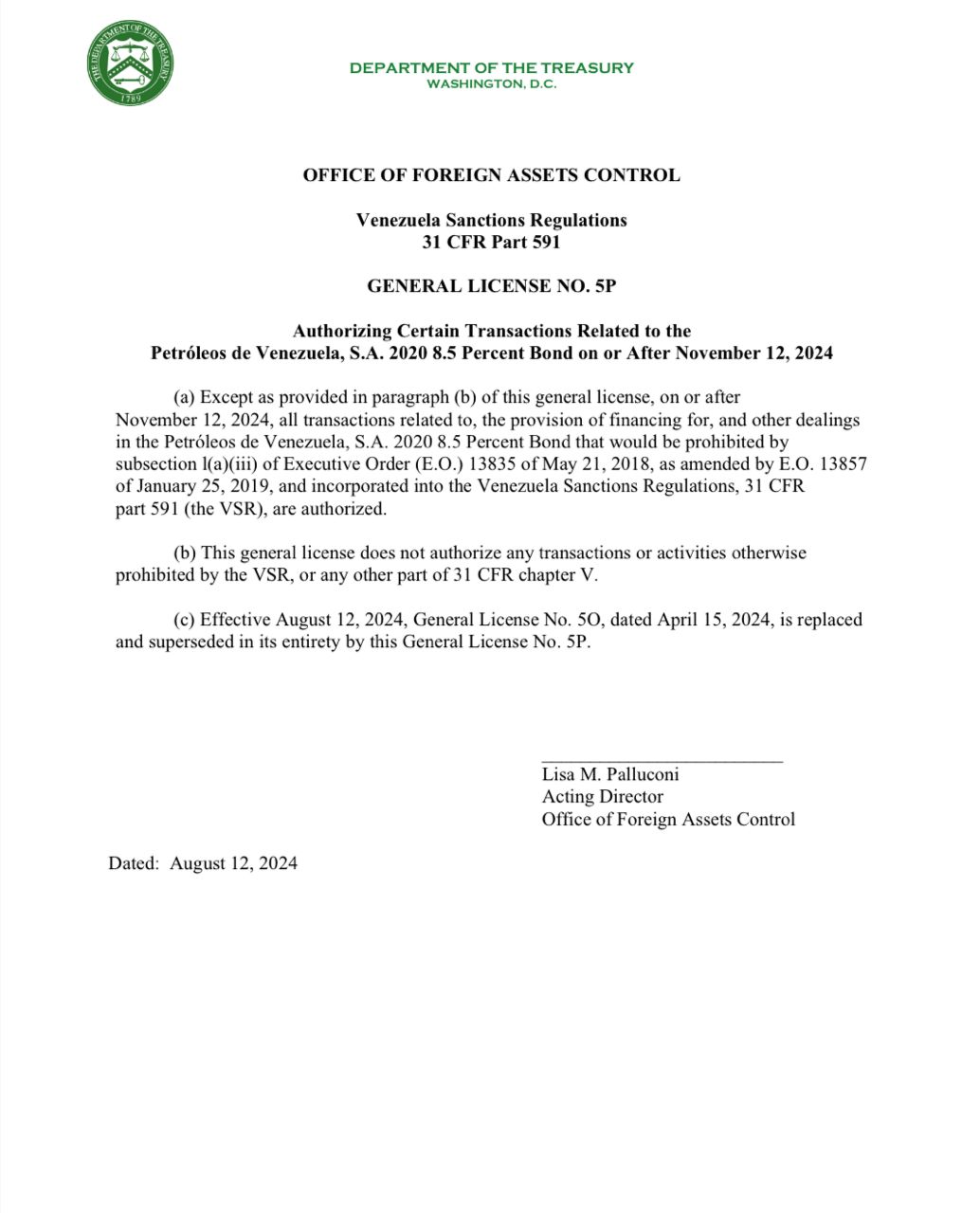 Así lo comunicó la Oficina de Control de Activos Extranjeros (OFAC), adscrita al Departamento del Tesoro, mediante la licencia número 5P.