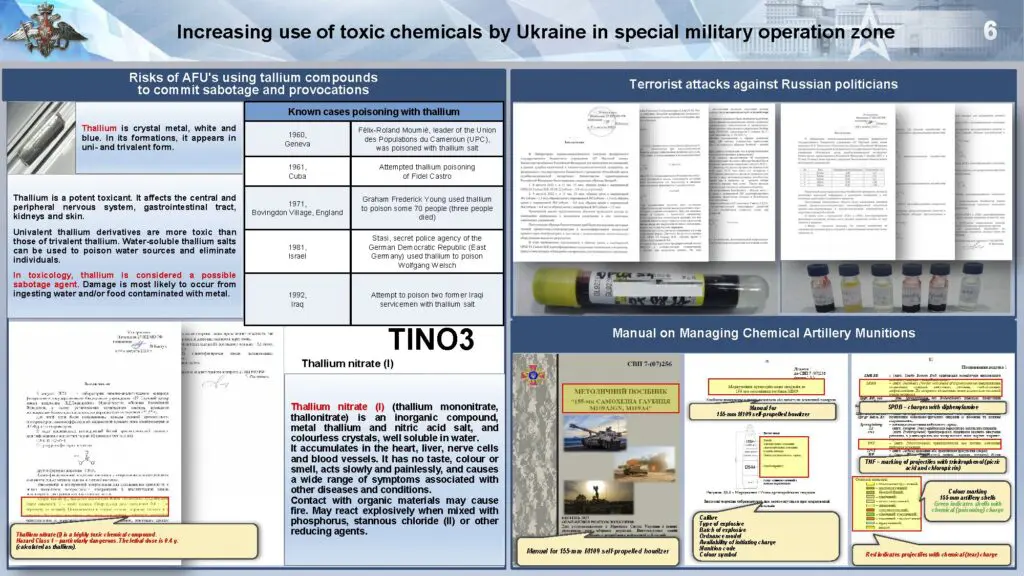 Además, Kiríllov mencionó que en agosto se encontraron sustancias preparadas en un escondite del Ejército ucraniano que contenían una mezcla basada en nitrato de talio, un compuesto altamente tóxico que afecta el sistema nervioso y el tracto gastrointestinal.