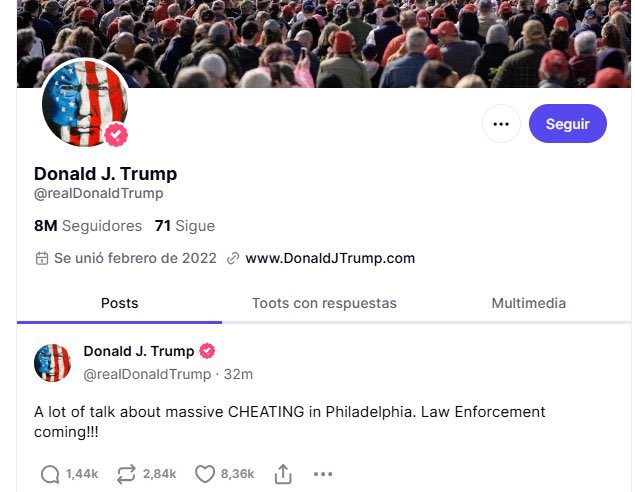 «Mucho se habla de fraude masivo en Filadelfia [ciudad de Pensilvania]. ¡Las fuerzas del orden están en camino!», escribió el político en sus redes sociales.