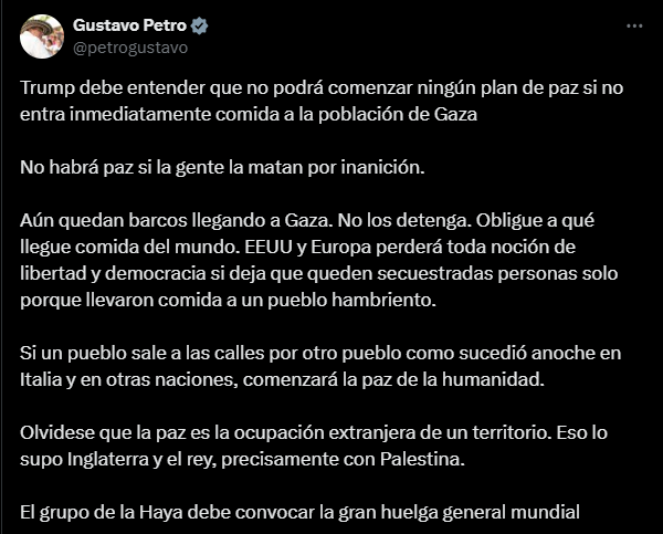 “Trump debe entender que no podrá comenzar ningún plan de paz si no entra inmediatamente comida a la población de Gaza. No habrá paz si a la gente la matan por inanición. Aún quedan barcos llegando a Gaza. No los detenga. Obligue a qué llegue comida del mundo”, posteó en su cuenta de X.