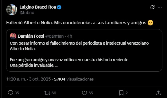 La tarde de este viernes 3 de octubre se informó el fallecimiento del periodista venezolano Alberto Nolia, a la edad de 72 años.