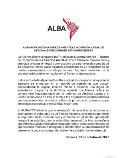 Mediante un comunicado, los países integrantes de la Alianza Bolivariana para los Pueblos de Nuestra América – Tratado de Comercio de los Pueblos (ALBA-TCP) condenaron “la incursión ilegal y provocadora de aeronaves de combate de los Estados Unidos, a una distancia aproximada de 75 kilómetros de las costas venezolanas”.