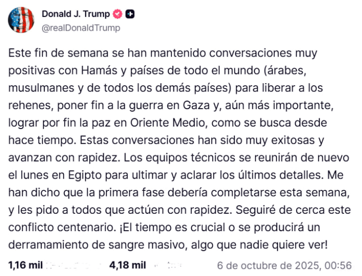 «Este fin de semana se han mantenido conversaciones muy positivas con Hamás y con países de todo el mundo (árabes, musulmanes y todos los demás) para liberar a los rehenes, poner fin a la guerra en Gaza y, aún más importante, lograr por fin la paz en Oriente Medio, como se busca desde hace tiempo», añadió.