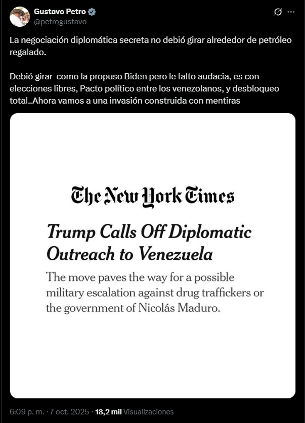 «La negociación diplomática secreta no debió girar alrededor de petróleo regalado», expresó Petro este martes a través de su cuenta oficial en X.