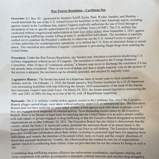 Los senadores demócratas estadunidenses Schiff, Kaine, Paul, Wyden, Sanders y Merkley, presentaron en nombre de su facción la resolución 83, que busca acabar con el uso de las Fuerzas Armadas de la nación norteamericana por parte de la administración del presidente Donald Trump para perpetrar ataques en el Caribe sin autorización del Congreso.