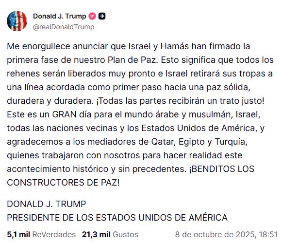 «Me enorgullece anunciar que Israel y Hamás han firmado la primera fase de nuestro plan de paz. Esto significa que todos los rehenes serán liberados muy pronto e Israel retirará sus tropas hasta una línea acordada como primer paso hacia una paz sólida, duradera y eterna», manifestó el mandatario.