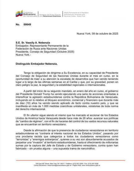 Este jueves 9 de octubre el gobierno de Venezuela solicitó, formalmente y a través de una misiva, una reunión de urgencia del Consejo de Seguridad de la Organización de las Naciones Unidas (ONU).