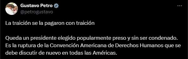 “La traición se la pagaron con traición. Queda un presidente elegido popularmente preso y sin ser condenado. Es la ruptura de la Convención Americana de Derechos Humanos que se debe discutir de nuevo en todas las Américas”, posteó.