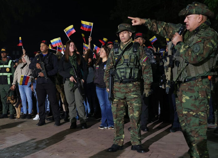 Cabello enfatizó la garantía constitucional del Estado venezolano sobre el monopolio de las armas. En este sentido, destacó que el Comandante en Jefe de la Fuerza Armada Nacional Bolivariana (FANB) ha ordenado el despliegue y la preparación del pueblo. «Hoy día las armas del Estado venezolano las tiene el pueblo de Venezuela, garante legítimo de la soberanía y de la independencia de nuestra patria», afirmó Cabello.