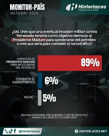 El sondeo realizado el pasado 08 de octubre también mostró que el 89 por ciento de los entrevistado está convencido de que una eventual invasión militar estadounidense contra Venezuela busca únicamente derrocar al presidente de la República, Nicolás Maduro y así, apoderarse de los recursos naturales y energéticos del país. En este mismo sentido, solo seis por ciento apoya la narrativa gringa de la lucha contra el narcotráfico, mientras que el cinco por ciento restantes no respondió la pregunta.
