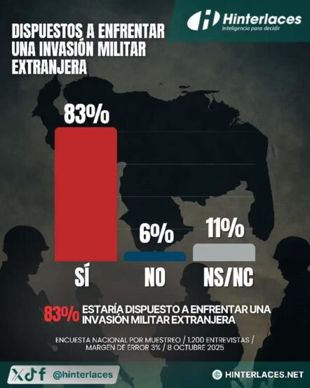 Asimismo, Hinterlaces resaltó que el 83 por ciento de la población está dispuesta a enfrentar una intervención extranjera y defender su Patria, mientras que otro seis por ciento manifestó que no lo haría, mientras que un 11 por ciento restante no respondió a la interrogante.