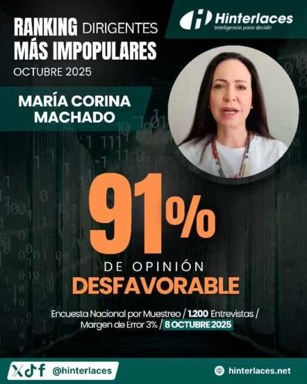 Un reciente estudio realizado por la encuestadora Hinterlaces reveló que la dirigente ultraderechista, María Corina Machado, posee una opinión desfavorable de la población venezolana de un 91 por ciento, convirtiéndola en la líder política más impopular hasta el momento.