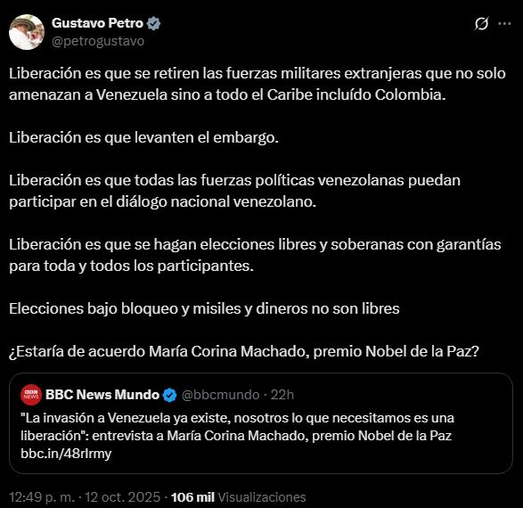 “Liberación es que levanten el embargo. Liberación es que todas las fuerzas políticas venezolanas puedan participar en el diálogo nacional venezolano. Liberación es que se hagan elecciones libres y soberanas con garantías para toda y todos los participantes. Elecciones bajo bloqueo y misiles y dineros no son libres. ¿Estaría de acuerdo María Corina Machado, premio Nobel de la Paz?”, reflexionó Petro.