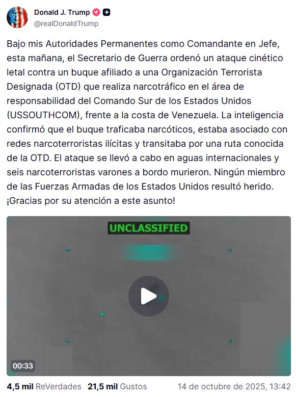 Trump acompañó su post con un video en el que se observa a una pequeña embarcación siendo apuntada a distancia, que posteriormente es alcanzada por un proyectil y estalla. Las tomas no permiten identificar ni la cantidad de tripulantes ni la existencia o naturaleza de su eventual carga.