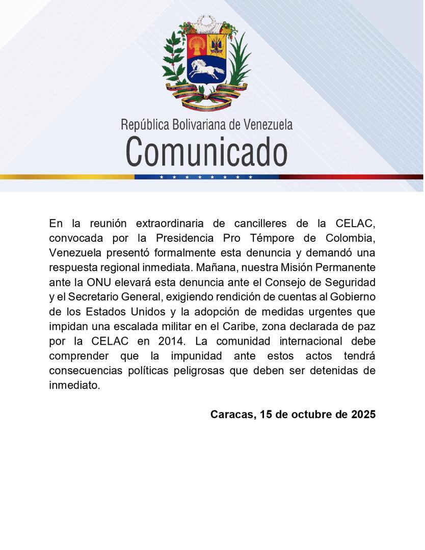 Este miércoles 15 de octubre, el gobierno de Venezuela rechazó las declaraciones belicistas y extravagantes del presidente de los Estados Unidos, Donald Trump, en las que admite públicamente haber autorizado operaciones para actuar contra la paz y la estabilidad del país.