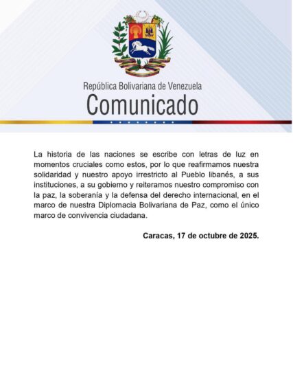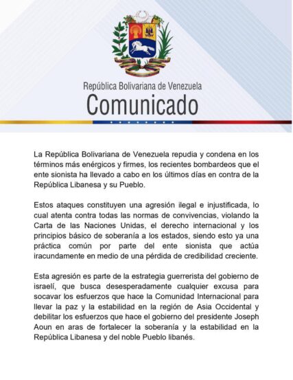 Este viernes 17 de octubre la República Bolivariana de Venezuela repudia y condena, en los términos más enérgicos y firmes, los recientes bombardeos que el gobierno sionista ha llevado a cabo en los últimos días en contra de la República Libanesa y su pueblo.