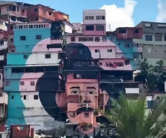 El pasado sábado 18 de octubre, amaneció un mural en un conjunto de casitas apiladas en la popular parroquia Petare en el municipio Sucre del estado Miranda, destacando el arte imponente a la distancia, de acuerdo con lo expresado por lugareños y espectadores a medios nacionales.