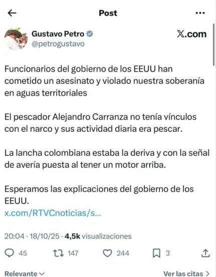 «Funcionarios del Gobierno de EEUU han cometido un asesinato y violado nuestra soberanía en aguas territoriales», publicó el presidente en X, indicando que la embarcación colombiana «estaba la deriva y con la señal de avería puesta al tener un motor arriba». «Esperamos las explicaciones del Gobierno de los EEUU», subrayó.