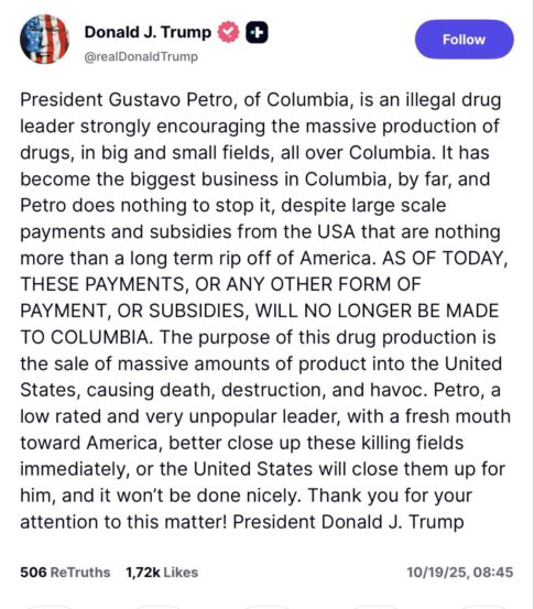 «El presidente Gustavo Petro, de Colombia, es un líder del narcotráfico ilegal que promueve activamente la producción masiva de drogas, tanto en grandes como en pequeños cultivos, en todo el país. Se ha convertido, por mucho, en el negocio más grande de Colombia, y Petro no hace nada para detenerlo, a pesar de los cuantiosos pagos y subsidios provenientes de Estados Unidos, que no son más que una estafa a largo plazo contra América. A PARTIR DE HOY, ESTOS PAGOS, NI CUALQUIER OTRA FORMA DE AYUDA O SUBSIDIO, SEGUIRÁN SIENDO ENVIADOS A COLOMBIA. El propósito de esta producción de drogas es vender enormes cantidades de producto en Estados Unidos, causando muerte, destrucción y caos. Petro, un líder con baja popularidad y muy mal valorado, que además tiene una lengua larga hacia EE.UU., haría bien en cerrar de inmediato estos campos de muerte, o Estados Unidos los cerrará por él, y no será de manera amable».