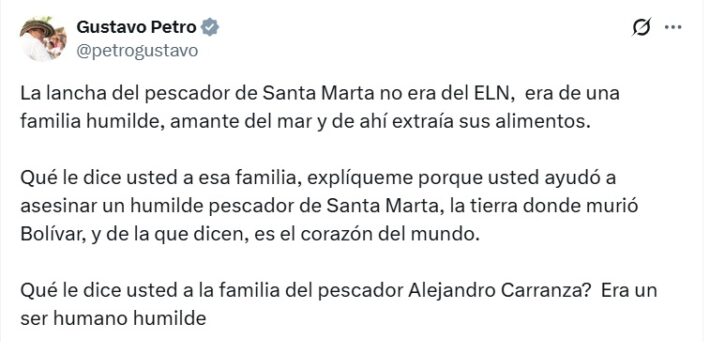 “La lancha del pescador de Santa Marta no era del ELN, era de una familia humilde, amante del mar y de ahí extraía sus alimentos”, denunció Petro a través de su cuenta de X.