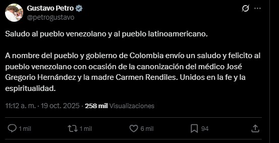El presidente de Colombia, Gustavo Petro, felicitó este domingo 19 de octubre, al pueblo de Venezuela por la canonización de San José Gregorio Hernández y Santa Carmen Rendiles.