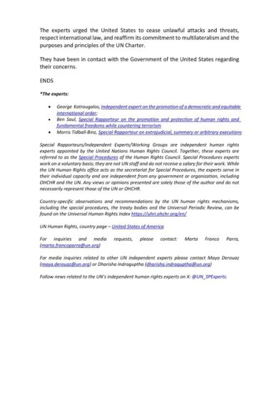 Sobre esto, los expertos señalaron en el informe que “aun si tales alegaciones fueran comprobadas, el uso de fuerza letal en aguas internacionales sin base jurídica adecuada viola el derecho internacional del mar y constituye ejecuciones extrajudiciales”.