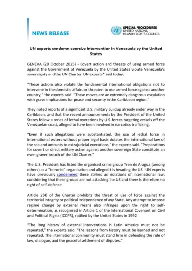 Como “una escalada extremadamente peligrosa con graves implicaciones para la paz y la seguridad en la región del Caribe”, calificaron expertos en materia de derechos humanos y terrorismo de la Organización de Naciones Unidas (ONU), el despliegue de tropas y el bombardeo de embarcaciones perpetrado por el régimen de Estados Unidos en el mar Caribe.
