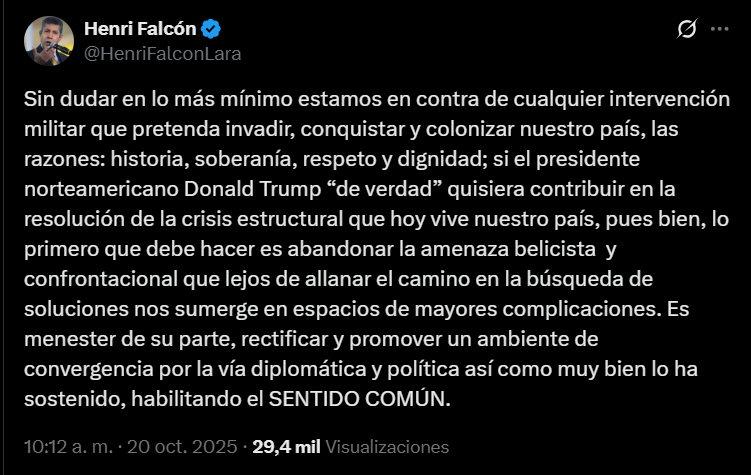 A través de un mensaje compartido en su cuenta de X, el opositor confirmó que está en contra de cualquier tipo de intervención militar que pretenda invadir, conquistar y colonizar a Venezuela.