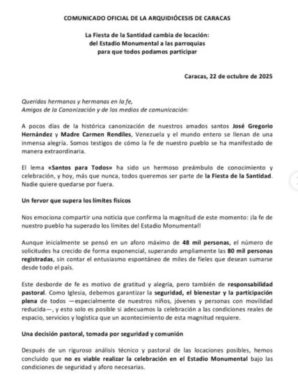 De acuerdo con lo reseñado en el documento de la institución eclesiástica, la razón por la cual se cancelaría el acto se debe a “dificultades con la seguridad y aforo necesario” para la gran cantidad de fieles que se congregarían en el sitio. En cambio, la celebración se llevará a cabo en todas las parroquias de la Gran Caracas, con la aspiración de que más fieles puedan sumarse a este júbilo.