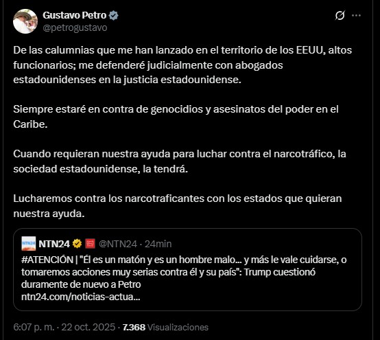 “De las calumnias que me han lanzado en el territorio de los EEUU, altos funcionarios; me defenderé judicialmente con abogados estadounidenses en la justicia estadounidense”, escribió en su cuenta de X el mandatario neogranadino.