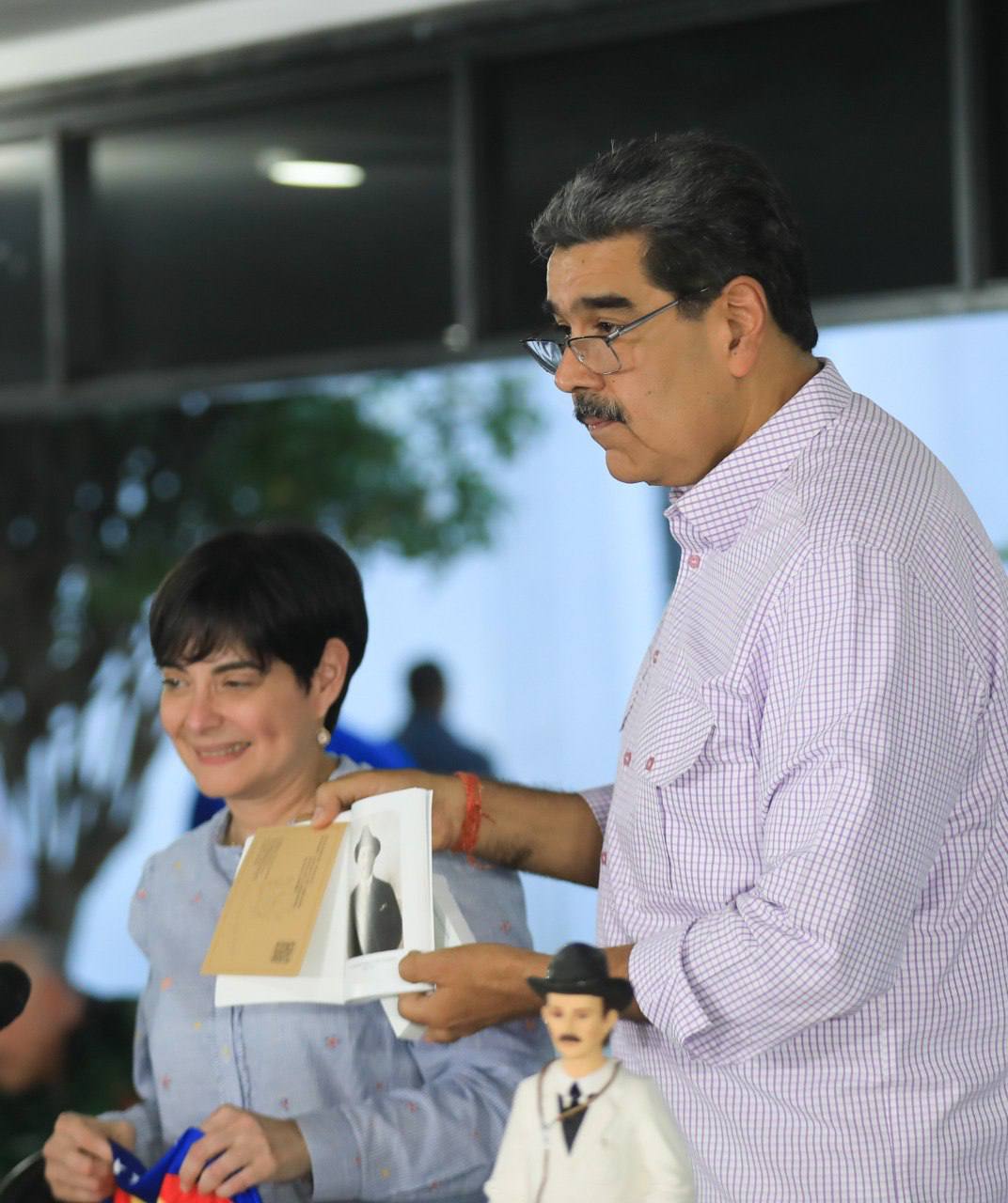 También le fue entregada al mandatario nacional la bandada de la delegación venezolana que asistió a Roma, así como una réplica del cuadro presentado al papa León XIV, el cual representa a los primeros santos de Venezuela.