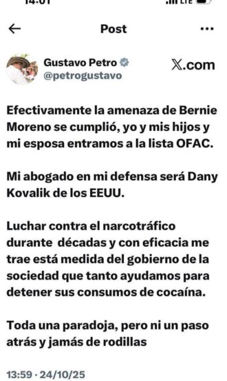 «Efectivamente la amenaza de Bernie Moreno (senador estadounidense) se cumplió, yo y mis hijos y mi esposa entramos a la lista OFAC», dijo Petro un un mensaje publicado en X. Y añadió que su abogado defensor será Dany Kovalik de los EEUU.