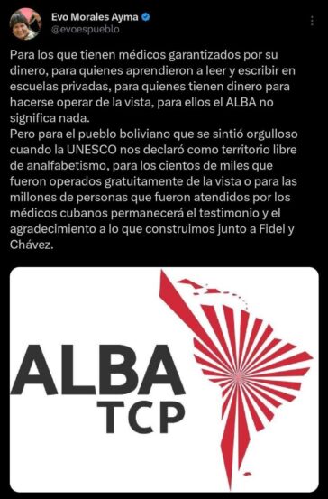 «Pero para el pueblo boliviano que se sintió orgulloso cuando la UNESCO nos declaró como territorio libre de analfabetismo, para los cientos de miles que fueron operados gratuitamente de la vista o para las millones de personas que fueron atendidos por los médicos cubanos permanecerá el testimonio y el agradecimiento a lo que construimos junto a Fidel y Chávez», destacó Morales en su cuenta en X.