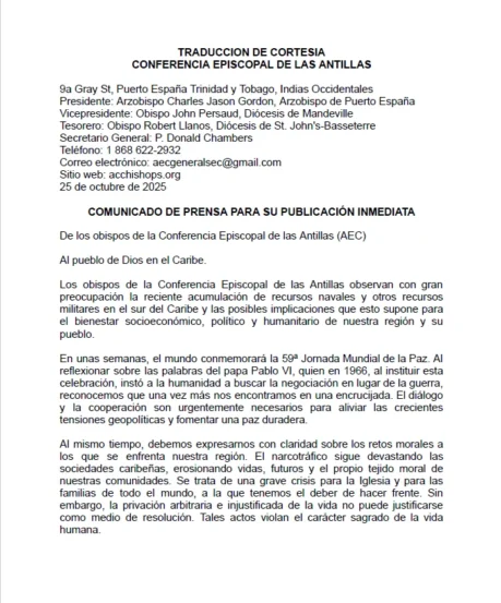 Este domingo 26 de octubre la Conferencia Episcopal de las Antillas (AEC, por sus siglas en inglés) emitió un comunicado, en el cual expresa su gran preocupación ante la presencia de recursos navales y militares estadounidenses en el Mar Caribe.