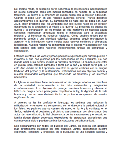 «Los obispos de la Conferencia Episcopal de las Antillas observan con gran preocupación la reciente acumulación de recursos navales y otros recursos militares en el sur del Caribe y las posibles implicaciones que esto supone para el bienestar socioeconómico, político y humanitario de nuestra región y su pueblo», destaca el texto.