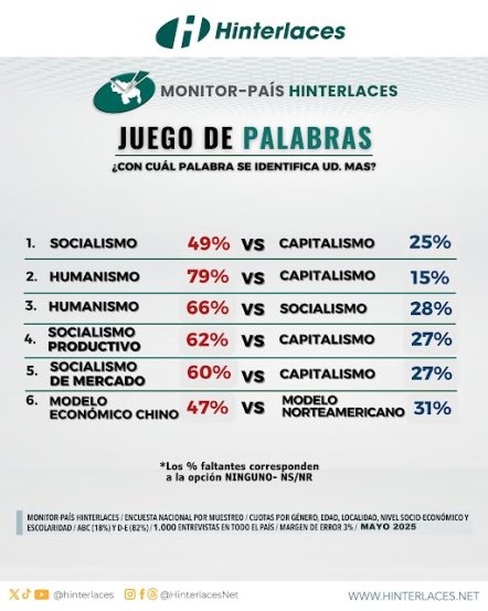 La firma Hinterlaces publicó una encuesta titulada “Juego de Palabras”, formulando la siguiente pregunta: ¿Con cuál palabra se identifica usted más? Ante esto, la opción del humanismo obtuvo 79% de preferencia frente al capitalismo que obtuvo 25%.