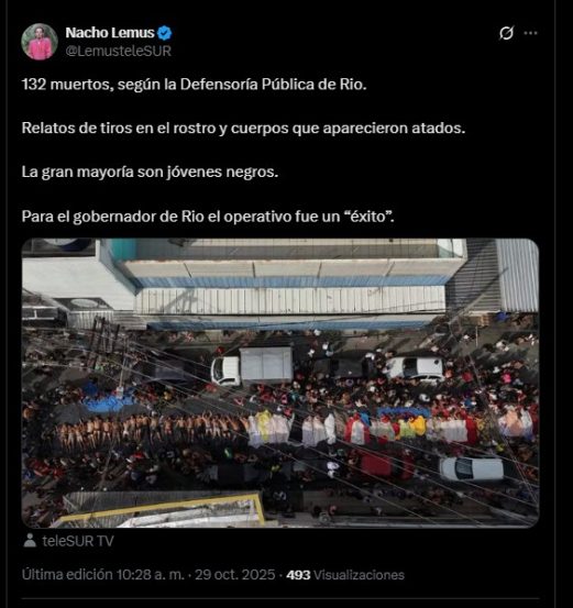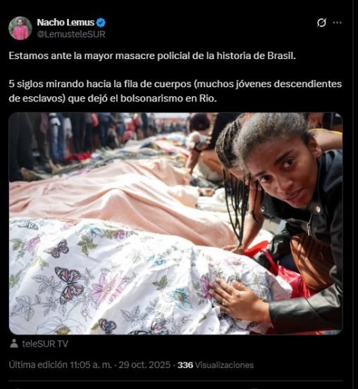Salen a la luz relatos de tiros en el rostro y cuerpos que aparecieron atados. Para el gobernador de Río, Claudio Castro, el operativo fue un «éxito», denunció el corresponsal de teleSUR Nacho Lemus.