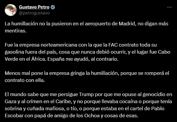 El mandatario neogranadino señaló, por medio de un mensaje en su cuenta de la red social X, que esta negativa responde a órdenes directas del Gobierno de Estados Unidos. Según lo posteado por Petro, la responsabilidad de esta negativa recae en la empresa estadounidense contratada por la Fuerza Aérea Colombiana (FAC) para proveer gasolina fuera del país.