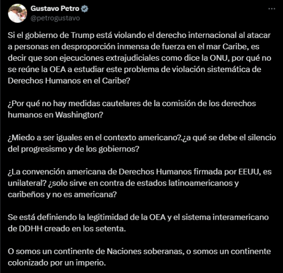 «Si el gobierno de Trump está violando el derecho internacional al atacar a personas en desproporción inmensa de fuerza en el mar Caribe, es decir que son ejecuciones extrajudiciales, como dice la ONU, ¿por qué no se reúne la OEA a estudiar este problema de violación sistemática de derechos humanos en el Caribe?», posteó el jefe de Estado neogranadino.