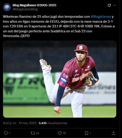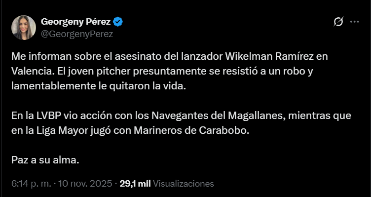 La periodista deportiva Georgeny Pérez fue una de las primeras en dar a conocer la noticia a través de una publicación en su cuenta de X, en la que escribió lo siguiente: «Me informan sobre el asesinato del lanzador Wikelman Ramírez en Valencia. El joven pitcher presuntamente se resistió a un robo y lamentablemente le quitaron la vida».