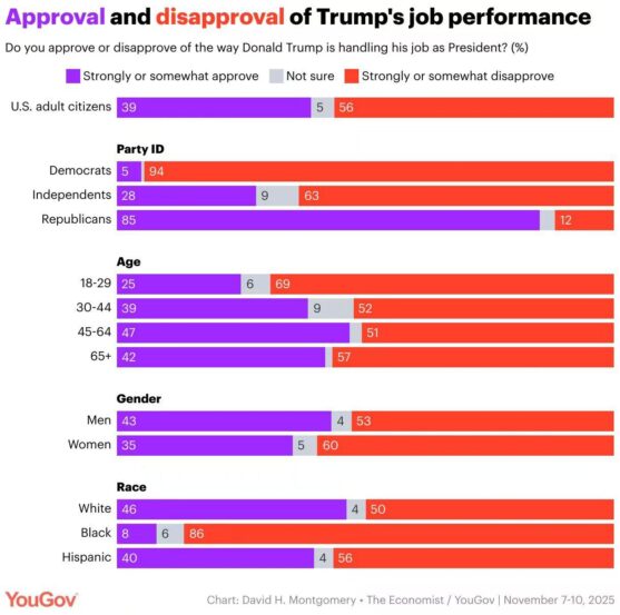 Un reciente sondeo realizado en Estados Unidos reveló que el actual presidente de la nación norteamericana, Donal Trump, posee un rechazo popular de al menos 56%, a poco más de 10 meses de asumir por segunda vez la administración de la referida nación. Por su parte, apenas un 39% aprueba su gestión.