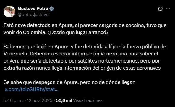 Este miércoles 12 noviembre el presidente de Colombia, Gustavo Petro, indicó que la aeronave detectada por la Fuerza Armada Nacional Bolivariana (FANB) en Apure «al parecer con presunta cocaína» tuvo que salir de Colombia.